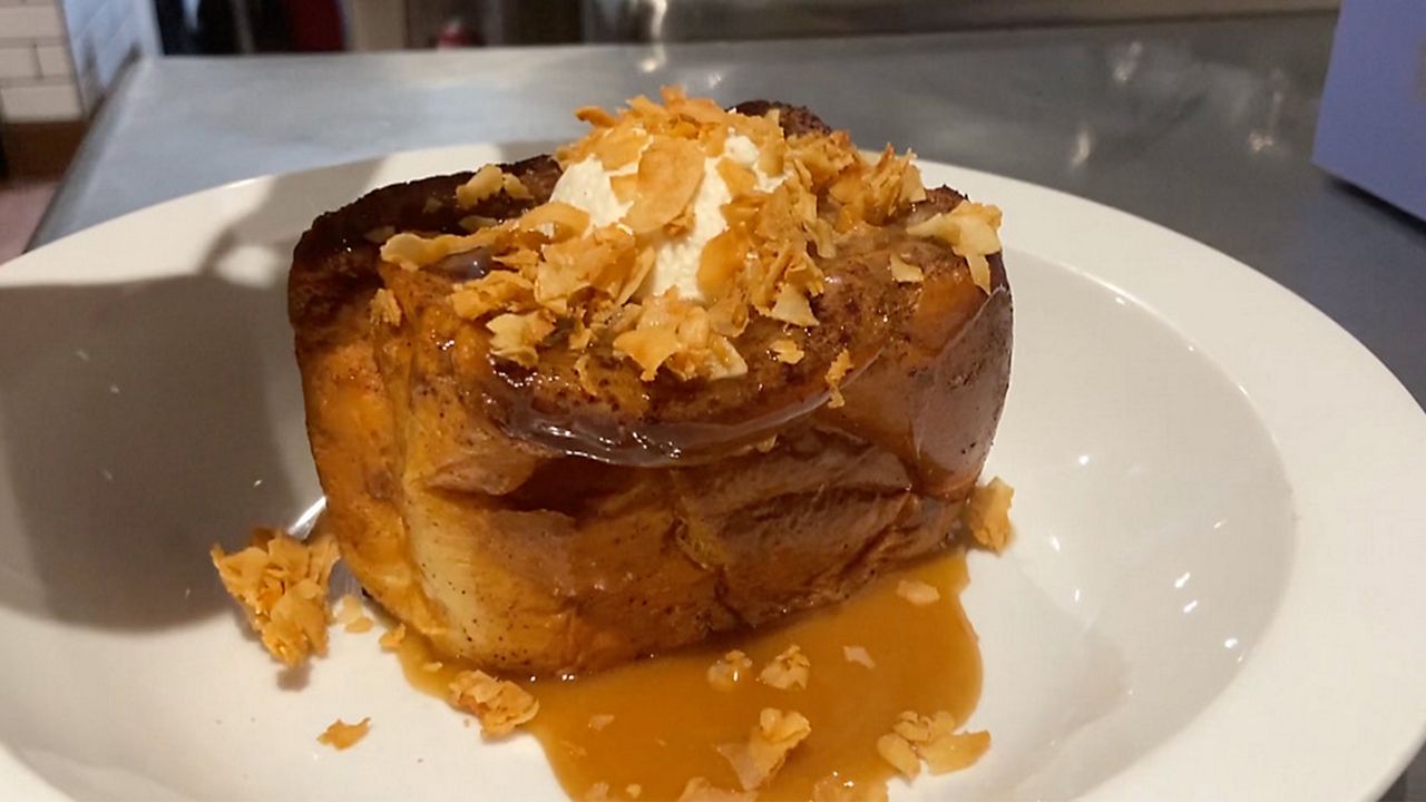 She infused her style with Johnson's favorite flavors making her own whipped cream, a peanut butter coconut maple syrup and coconut chips all covering a big brique, which is a thick-cut brioche toast dipped in a custard batter.